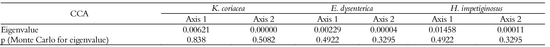 Low eigenvalues indicate the existence of short gradients, lower than 0.3, which are of low relevance in determining the variation in the data, considered homogeneous data (Felfili, Carvalho, Libano, Venturoli, & Pereira, 2007). That is, the correlation was not able to accurately explain the distribution of the species in each substrate in the gradient. The Monte Carlo permutation test with 10,000 randomizations was not significant (p > 0.01), which indicated that for the two axes, the gradients of species in each substrate are random considering this database.