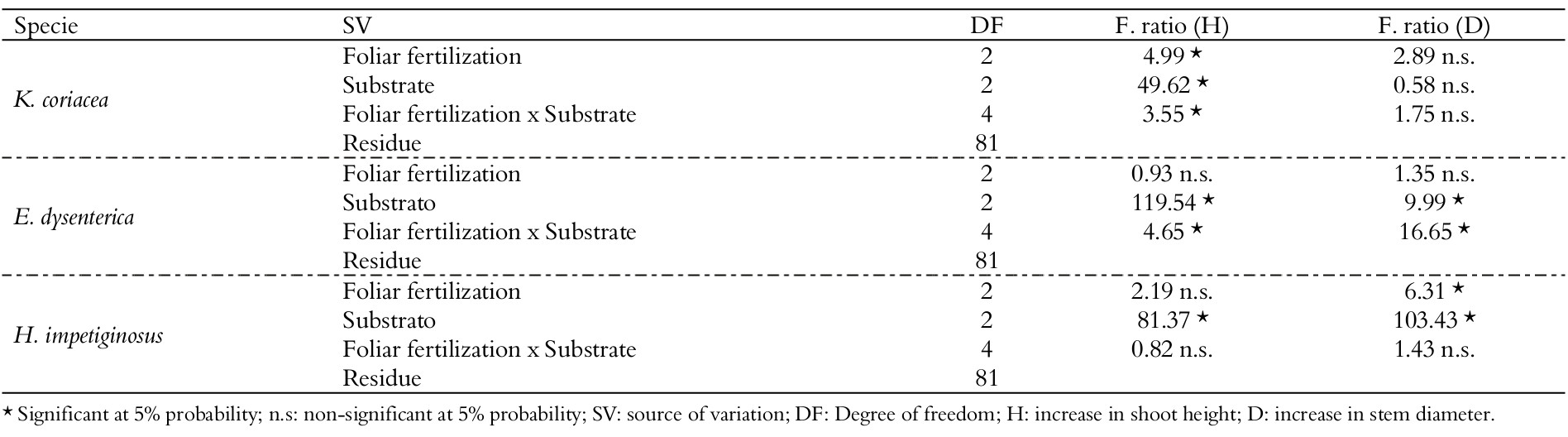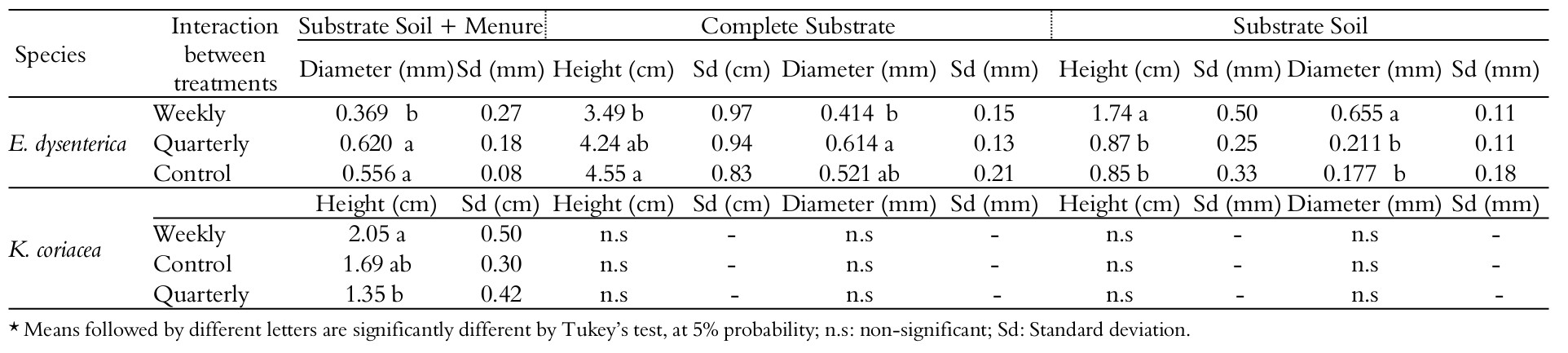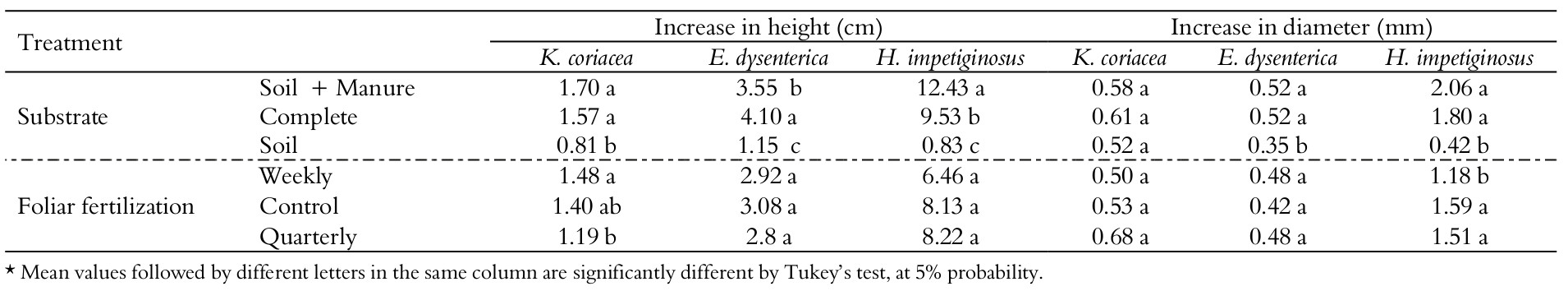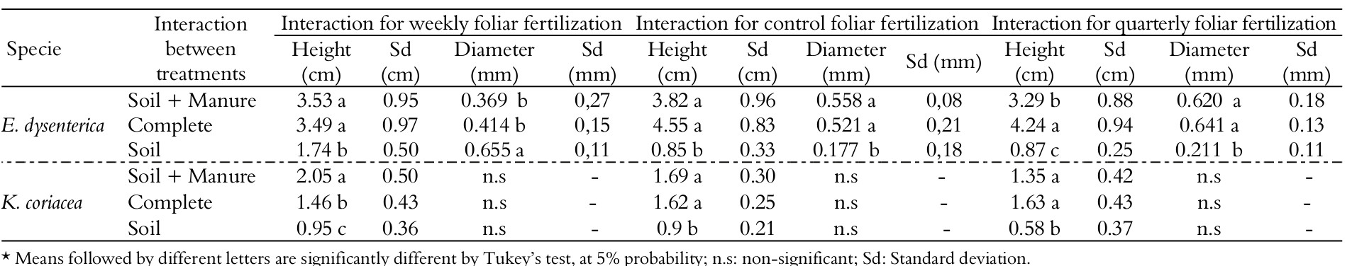 For interactions between treatments, F-test evidenced significant effects only for K. coriaceae and E. dysenterica. The interaction of substrate treatments within each level of foliar fertilization demonstrated that K. coriaceae showed better results for increase in height for the substrate Soil + Manure in all interactions; as for the diameter, there were no significant difference between interactions.