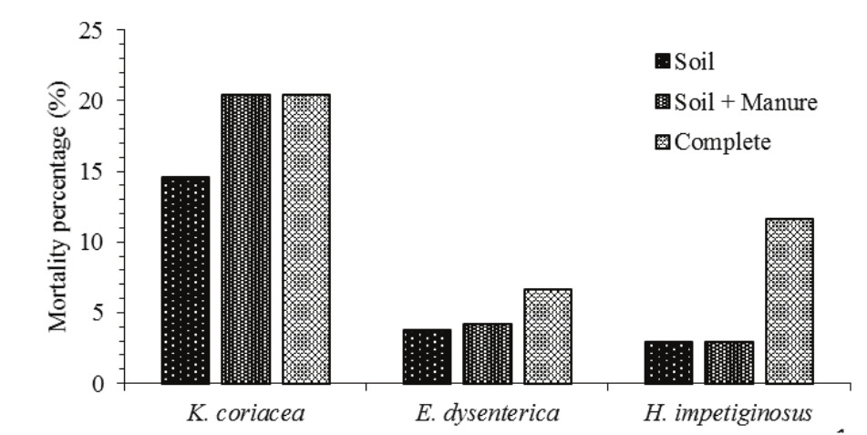 The substrate Soil + Manure showed different behavior regarding the mortality rate for each species: H. impetiginosus showed lower mortality rate, which is similar to that of the substrate Soil (2.92%); for E. dysenterica, this substrate showed values in the mortality rate of 4.17%, lower than the Complete substrate and higher than the Soil substrate; and for the K. coriacea species presented a mortality rate equivalent to the Complete substrate of 20.4%.
