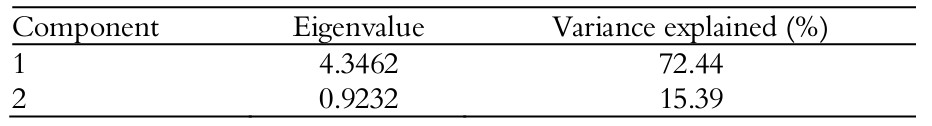 With the exclusion of the least relevant chemical variables, the principal component analysis (PCA) showed the formation of groups in relation to the different types of substrates. The first two principal components explained together 87.8% total variability (Table 6). The choice of the number of PCA components used for data interpretation is an empirical criterion, where some authors recommend using a set of components that together accumulate at least 70% of the total (Rencher, 2002).