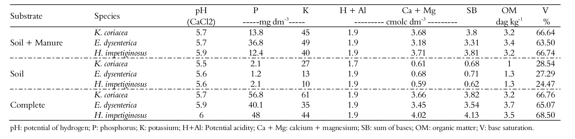 As for phosphorus (P) and potassium (K), in general, the Soil+Manure substrate presented better results, with more adequate contents of these macronutrients when compared to the Complete substrate, which presented higher amounts of phosphorus, above the recommended for agricultural crops. The results of chemical analysis of soil is presented in Table 5.
