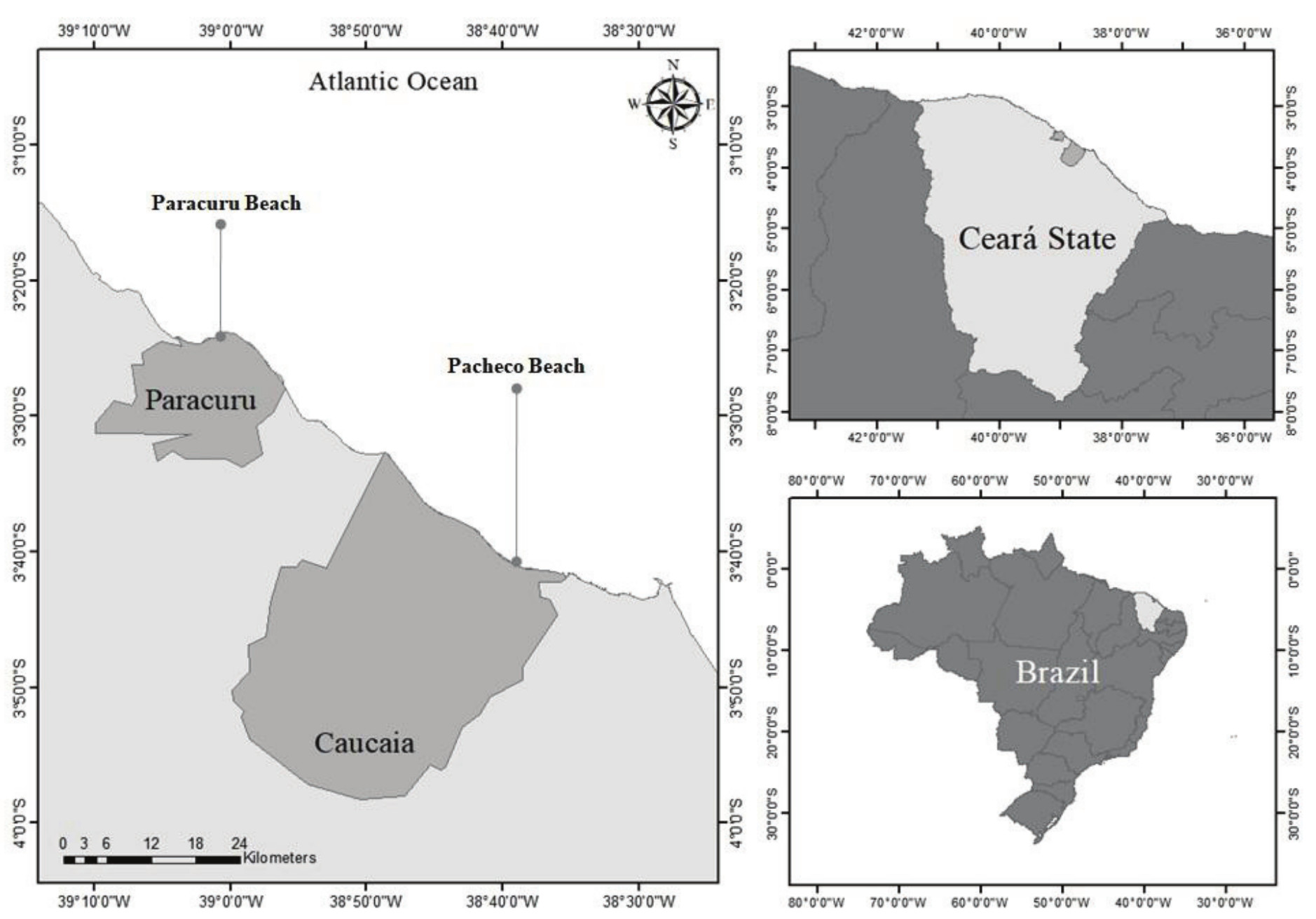 Samples were collected in natural banks during syzygy tides in the coastal area of Paracuru (Latitude 3°23'52"S, Longitude 39°0'46"W) and Pacheco (Latitude 03°41'06.8"S, Longitude 038°38'02.8"W) from the cities of Paracuru and Caucaia, Ceará State, respectively, in August 2013 (Figure 1). Species of red, green and brown macroalgae were collected according to local occurrence and evidence of biological activity in previous literature.