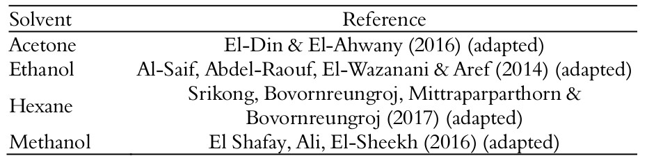 The lyophilized samples were grinded and, from the resulting powder, extraction with the organic solvents hexane, acetone, ethanol and methanol was performed, following the crescent polarity order and using a 1:10 proportion (p/v). The choice of the solvents was performed according to previous researches (Table 1). The samples were kept under stirring at 80 to 85 rpm for 48 hours in an incubator (TECNAL TE-420). Extracts were then filtered through a paper filter (WHATMAN) and put in a rotary evaporator (FISATOM®) until the production of a dense solution. The extract was kept in a desiccator for 48 hours in vacuum, for the complete remotion of the solvent. Afterwards it was weighted in an analytical scale and diluted in sterile distilled water. Then, white sterile disks (Laborclin®) in 6mm of diameter were put in contact to 40 µL of the algae extracts, amounting to 1 mg of the concentrate on each disk.