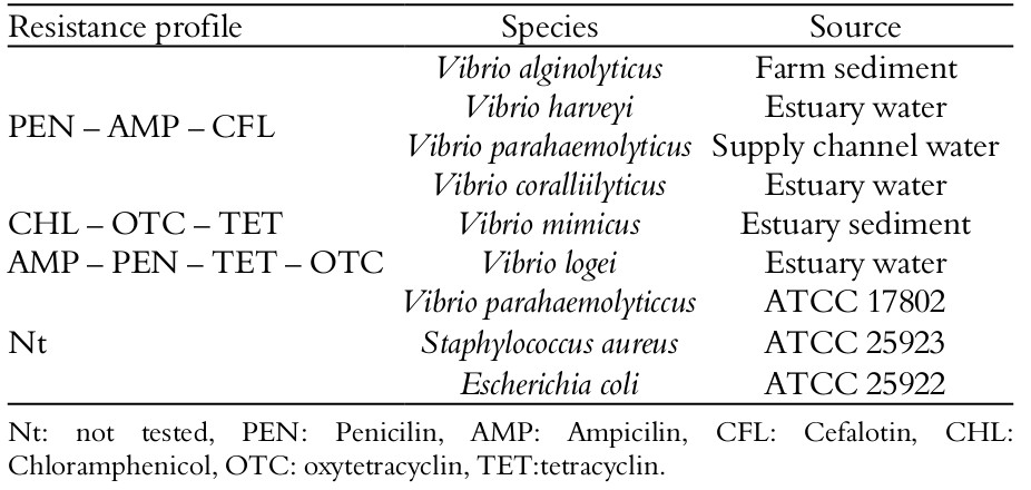 Gram-negative bacteria belonging to the Vibrio genus are well-known pathogens in marine shrimp farms, being related to infection events and consequent loss in production (Vieira et al., 2010; Vanmaele, Defoirdt, Cleenwerck, Vos, & Bossier, 2015). The use of antimicrobial agents in the treatment and prevention of these infectious diseases results in the selection of resistant strains, which accrue a series of losses to public health, environment and the activity itself.