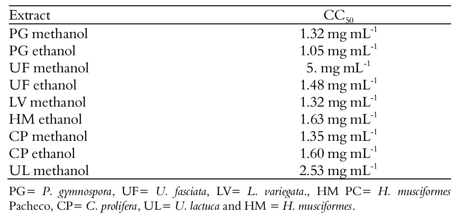 The evaluation of cytotoxicity comprised the use of cells from the Vero line for the extracts obtained with methanol and ethanol, analyzed by the MTT assay, as described in the methodology section. According to the results of CC50 calculations (rate in which the cytotoxicity causes the death of 50% of bacteria), obtained in mg mL-1, the extracts presented a cytotoxic effect from the 1.05 mg mL-1 concentration, tested for the brown alga Padina gymnospora, up to the 5.92 mg mL-1 concentration for Ulva fasciata (Table 4). The cytotoxicity tests were only possible for macroalgae alcoholic extracts (methanolic and ethanolic) due to solubility to that extractors and also the available quantity for the assays.