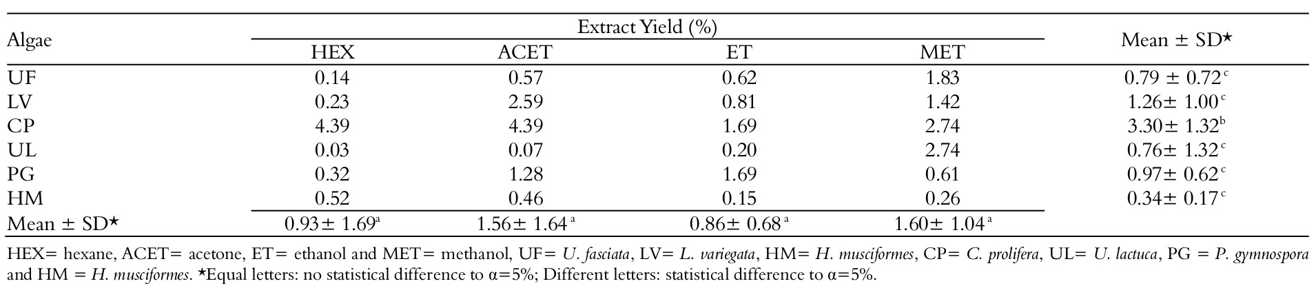The yield of the extracts using the organic solvents hexane, acetone, ethanol and methanol is shown on Table 5. No statistical difference was observed in the yields by extractive organic substance (F = 0.5218, p = 0.6758). However, by marine macroalgae group, it was verified that Caulerpa prolifera (CP) (Table 5) extracts had higher yields than all the others (F = 48.709, p = 0.0057).