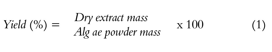 Extract yielded was calculated from the total mass of grounded algae powder using the following equation. The Yield values, by marine macroalgae and by extractive substance, were submitted to analysis of variance (ANOVA-one way, α = 5%), in order to verify possible differences by groups (extractive substance or marine macroalgae). Statistical analyses were performed in R software (version 3.4.4).