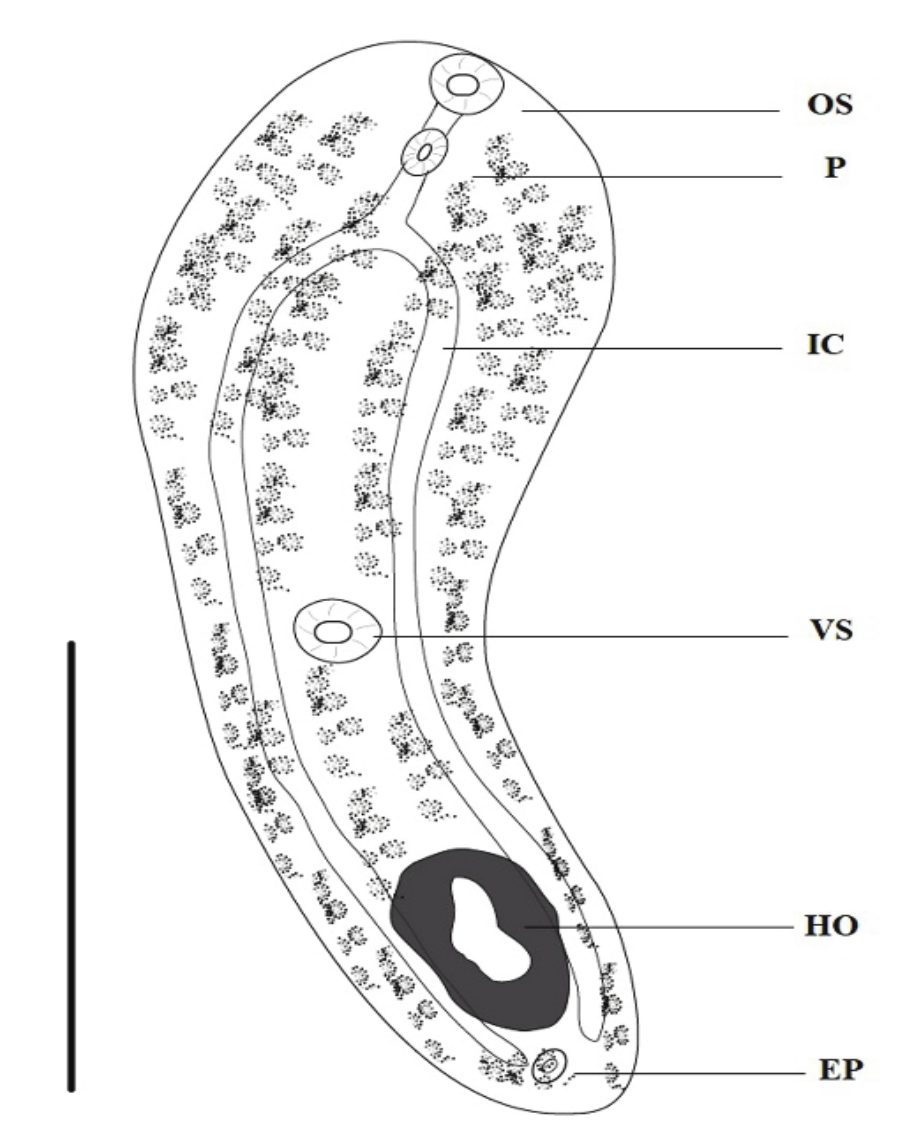 They were identified on the basis of large and elongate body, 1.41 (1.20 – 1.62) length, 505.55 (442.64 – 568.49) wide, which consists of oval shaped fore body and bluntly pointed hind body; pseudo-suckers indistinct; oral sucker, 74.03 (64.14 – 82.73) length, 78.92 (60.29 – 96.94) wide; ventral sucker, 173.46 (139.98 – 214.60) length, 136.45 (101.41 – 152.07) wide; elliptical holdfast organ, 284.15 (235.81 – 344.52) length, 157.37 (138.13 – 168.44) wide; oval pharynx; intestinal caeca extending up to the posterior region of the body and excretory pore present at the terminal portion of the body; vitellaria distributed throughout the body. The distance between oral and ventral sucker, 538.22 (488.48 – 579.91); distance between ventral sucker and holdfast organ, 358.52 (253.99 – 442.62). (Figure 1).