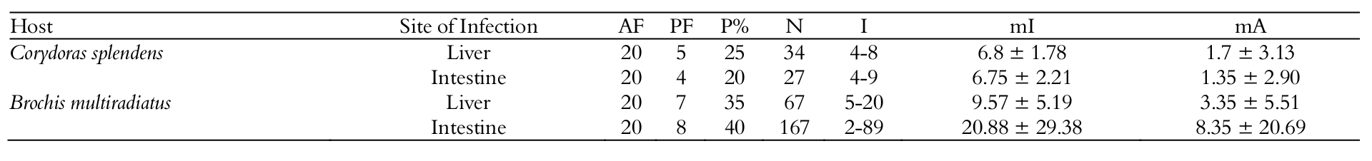 The differentiation of metacercariae, which are frequently encountered in fish, is especially problematic (Chappell, 1995; Niewiadomska, 1996; Niewiadomska & Laskowski, 2002). Identification of metacercariae is made more difficult by the lack of a key devoted to this stage in the life cycle. All present keys and monographs are based on adult stages (Niewiadomska, 2002). Additionally, identification of species of Tylodelphys is difficult due to striking morphological similarity, and especially at the metacercariae stage (Niewiadomska, 1996). In this study, it was not possible to identify the species, due to the stage of the parasite and due to the lack of taxonomic keys for this genus. This study represents a contribution to the study of this group of parasites. Parasitological studies on piscivorous birds that feed on callichthyids would be necessary to identify the parasite species.