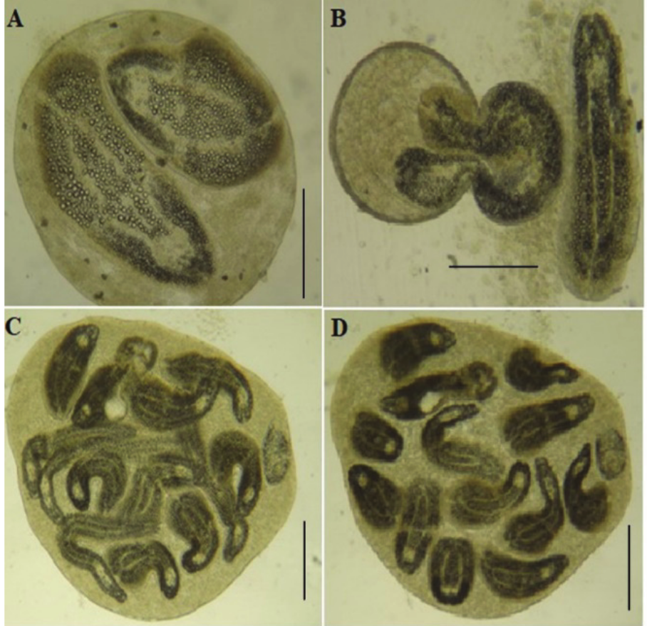 Higher parasitic indexes were reported for B. splendens (Table 1). Some parasites were found free, others in pairs and in groups varying in number, between 7-15 individuals inside of a circular membrane (Figure 2).
