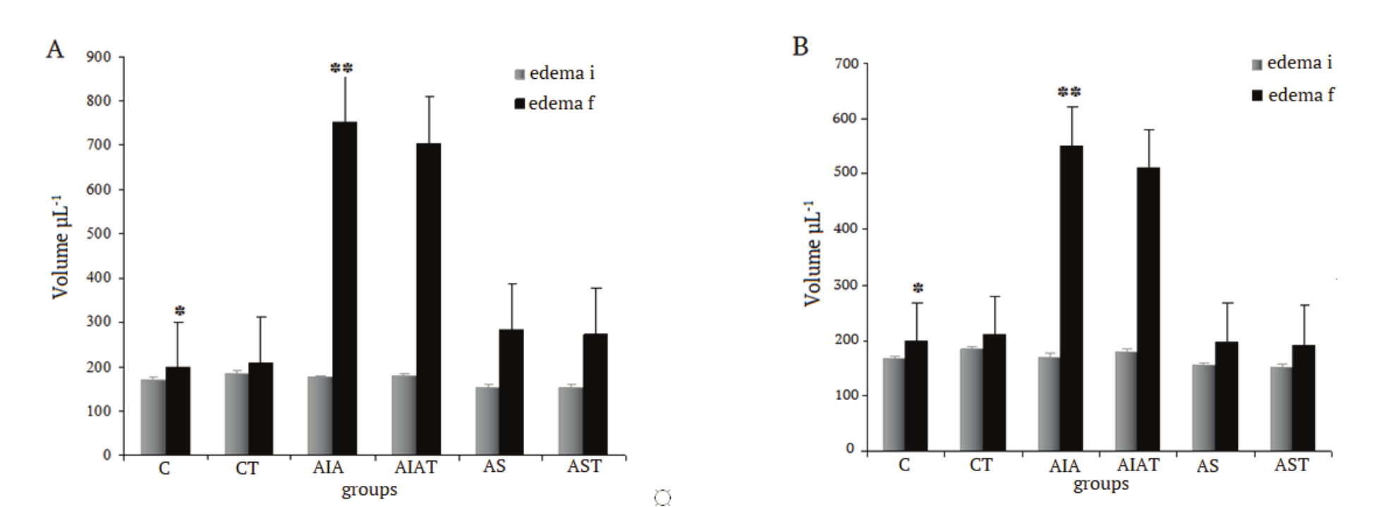 The AIA and AIAT groups presented increase in hind paw volume compared to C group (p< 0.05). There was no significant difference in paw volume between groups C, AS and AST (p > 0.05) (Figure 1A and 1B).