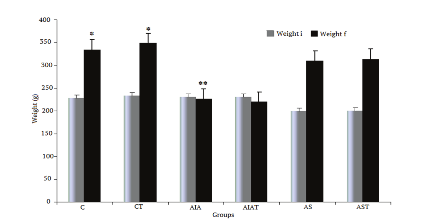 There was a decrease in the final body weight in the animals of groups AIA and AIAT compared to group C (p < 0.05). Rats from groups AS, AST and C did not showed difference in final body weight (p > 0.05) (Figure 2).