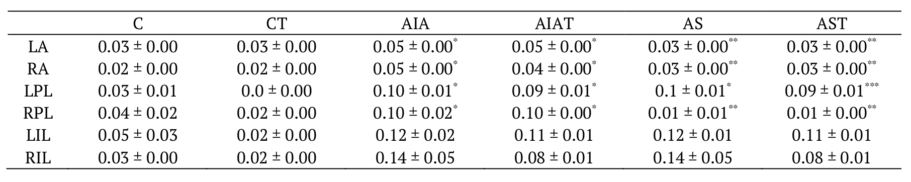 Weight increase was observed on the left adrenal gland, right adrenal gland, right and left popliteus ganglia in AIA and AIAT groups compared to the C group (p < 0.05) (Table 1).
