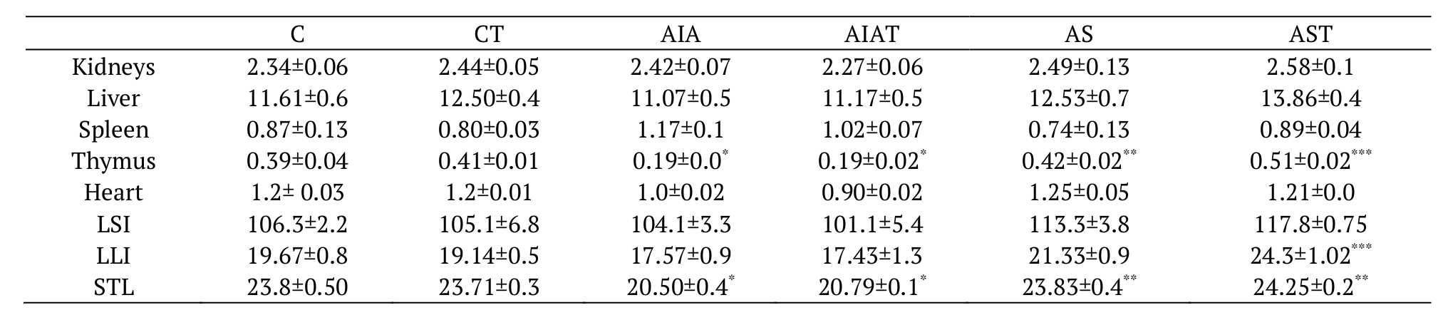 It has been identified in groups AIA and AIAT a decrease in thymus weight and a worse body development evidenced by the nose-tail length compared to group C (p < 0.05) (Table 2).
