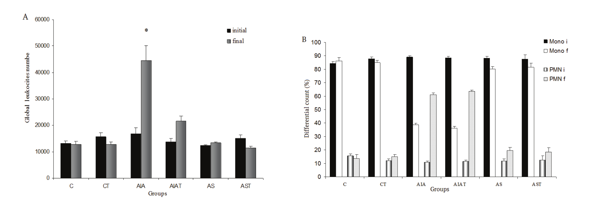 It was evidenced in group AST high weight of the thymus, greater length of the large intestine and of the nose-tail length. Compared to other groups these results showed a tendency to significance (Table 2). Considering these results with the changes in blood leukocytes, in which was an increase in total leukocyte and in subpopulation of polymorphonuclear leucocytes when compared to the baseline count, it confirms that both concentration of adjuvant effectively established experimental model, which presented different ways of development of adjuvant-induced arthritis (Figure 3).