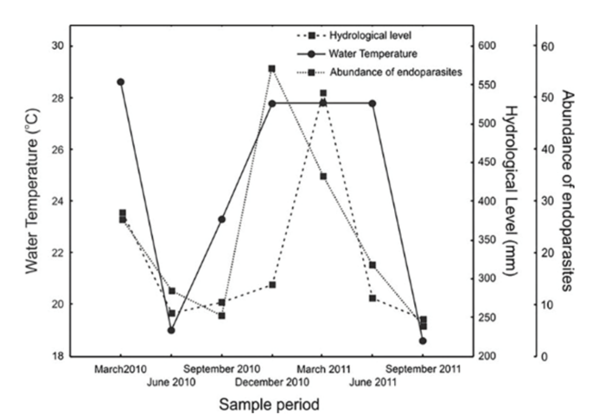 Higher temperatures and hydrological levels were observed between December 2010 and March 2011, and also a greater abundance of endoparasites (Figure 5).