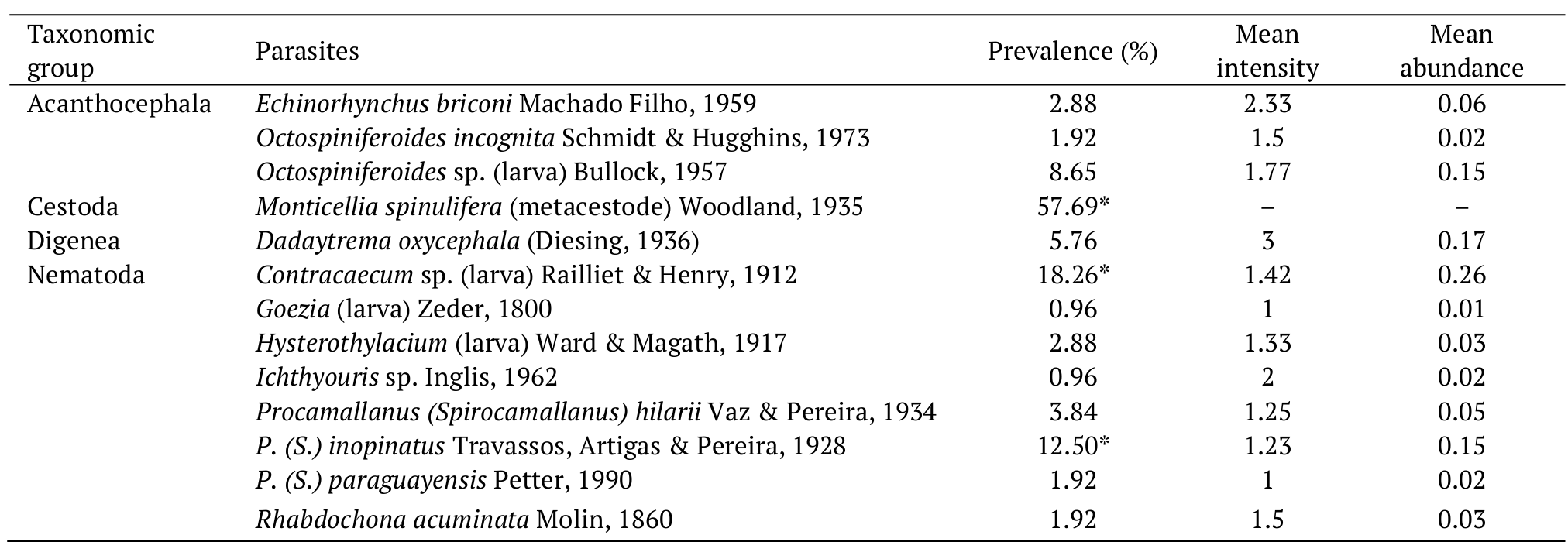 Out of the 104 fish examined, 72 (69.23%) were parasitized by at least one parasite species. A total of 163 endoparasites belonging to 13 species were collected (Table 1). The majority of parasite specimens collected were larvae of Contracaecum sp. (18.6%), followed by Procamallanus (Spirocamallanus) inopinatus (12.50%) and metacestodes of Monticellia spinulifera (57.69%); Dadaytrema oxycephala was the species that showed the highest mean intensity (Table 1).
