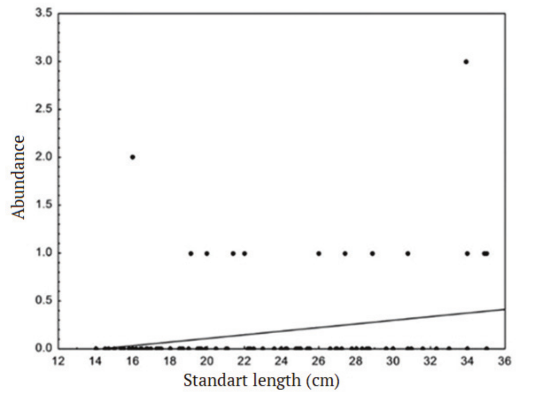 The mean standard length of the fish analyzed was 17.10 ± 27.69 cm. Among the parasites that showed a prevalence exceeding 10%, a positive and significant correlation was detected between the standard length of B. orbignyanus and the abundance of P. (S.)inopinatus (r = 0.25, p = 0.008) (Figure 2). On the other hand, there was no significant correlation between the standard length of the fish and the prevalence of P. (S.) inopinatus (r = 0.56, p = 0.07). There was also no correlation between prevalence (r = –0.08, p = 0.80) and abundance (rs = 0.05, p = 0.558) of Contracaecum sp. larvae and the standard length of hosts.