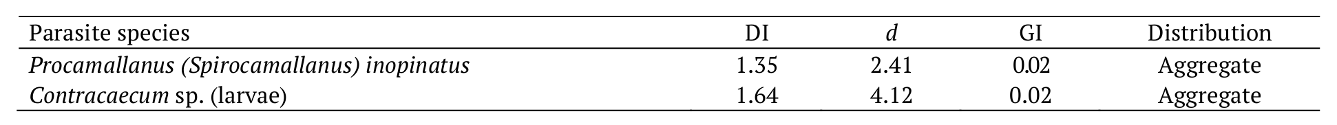 The parasite P. (S.) inopinatus and Contracaecum sp. showed an aggregated distribution type, according to the dispersion index. It is probable that the low value of Green’s index was caused by the low abundance of parasites, despite the aggregation (Table 2).