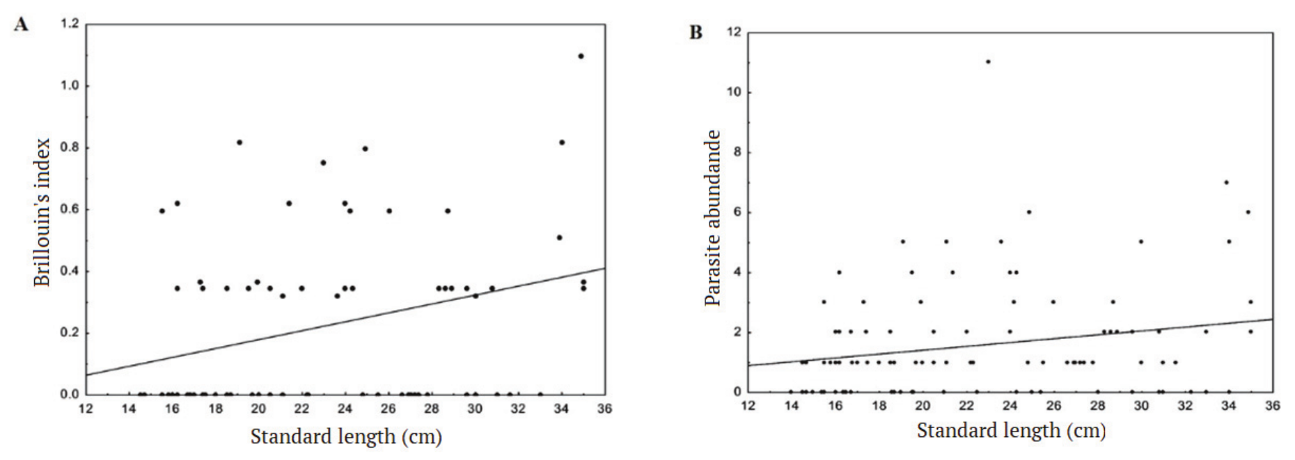 Mean infracommunity diversity correlated positively and significantly with the standard length of hosts (rs = 0.30, p = 0.009) (Figure 3A) and the abundance (rs = 0.20, p = 0.03) (Figure 3B) of endoparasites.