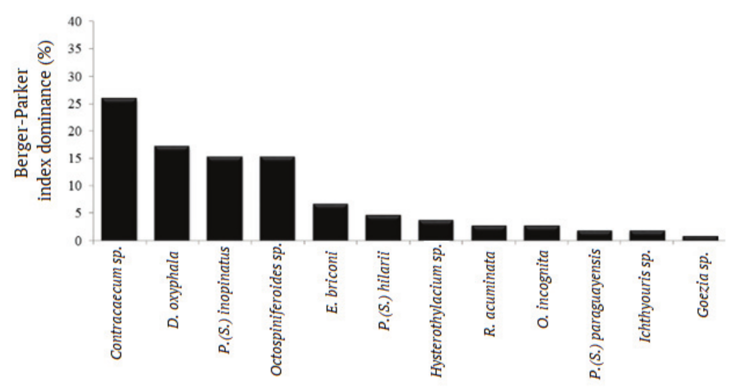 The mean Berger–Parker dominance index was 3.85 ± 0.26. Contracaecum sp. (larvae) was the predominant species, with 27 specimens (25.96% of total parasites), followed by the digenean D. oxycephala, nematodes of the species P. (S.) inopinatus and acanthocephalan Octospiniferoides sp. (larvae), resulting in high diversity (Figure 4).