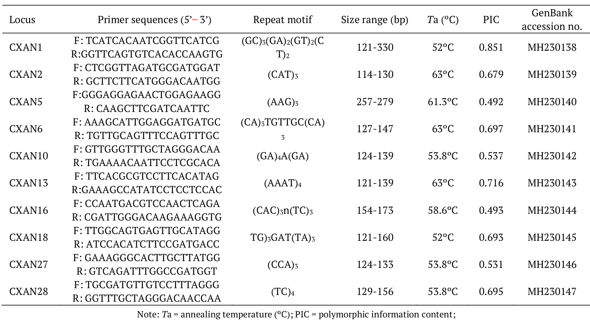 The simple sequence repeat (SSR) marker is a powerful technique for characterizing allelic diversity and it is frequently used in population studies due to their high level of polymorphism and codominant inheritance (Ellegren, 2004;Deng, Wang, Zhu, Wen, & Yang, 2015). The purpose of our study was to develop and characterize microsatellite loci for C. xanthocarpa for further application in population genetic studies and to boost strategies for conserving the genetic resources of this species and to assess cross-amplification in two related species.