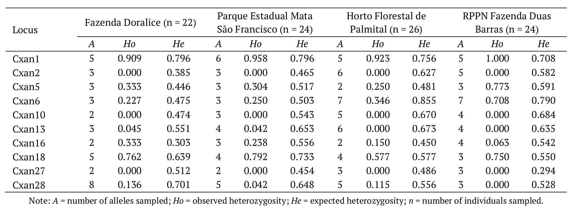 The patterns of genetic polymorphism observed in C. xanthocarpa for 10 microsatellite loci suggest that these markers can be used as valuable sources of information for the actual level of genetic conservation of C. xanthocarpa in their distribution area. A similar study was carried out by Ruas et al. (2009) and the microsatellite loci developed by those authors were employed by Conson et al. (2013), to verify if the forest fragmentation that began last century, in South and Southeast Brazil affected the genetic variability of the tree species Luehea divaricata. Chaves et al. (2016) used microsatellite loci, developed by Ramos et al. (2011), to demonstrate the apomictic and sexual reproduction, polen and seed dispersion of the tree species Aspidosperma polyneuron.