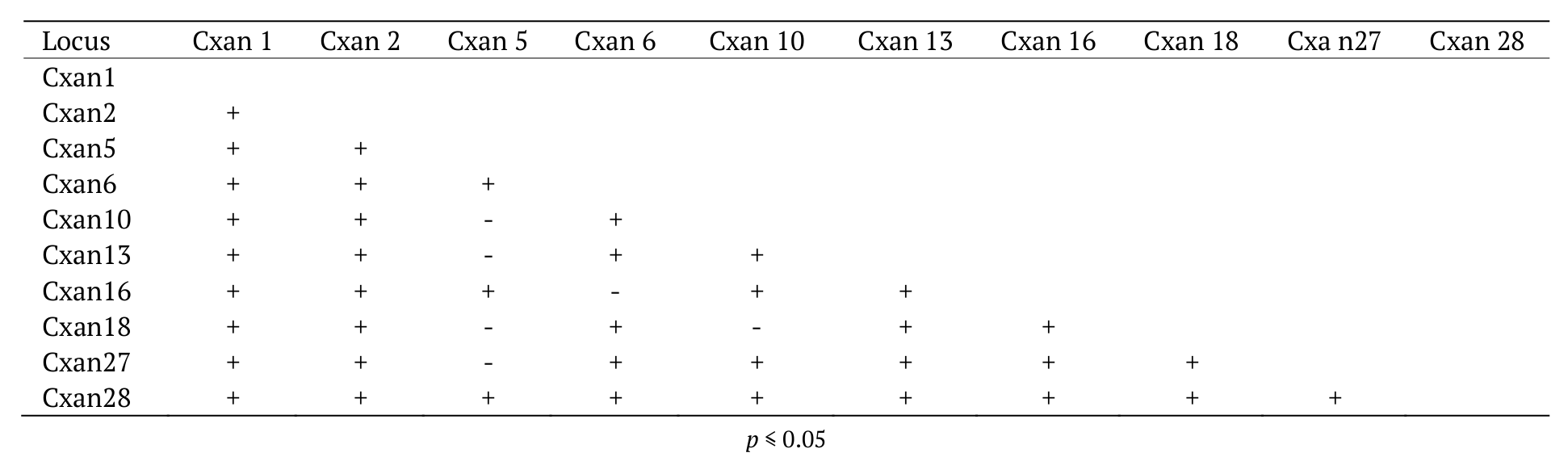 Pairwise comparisons for multiple tests among the polymorphic loci showed significant linkage disequilibrium between loci (Table 3), while 8 loci showed significant evidence for the presence of null alleles (Cxan2, Cxan5, Cxan6, Cxan10,Cxan13, Cxan16, Cxan27, Cxan28) according to Bonferroni correction (p ≤ 0.05), which can indicate homozygosis excess.