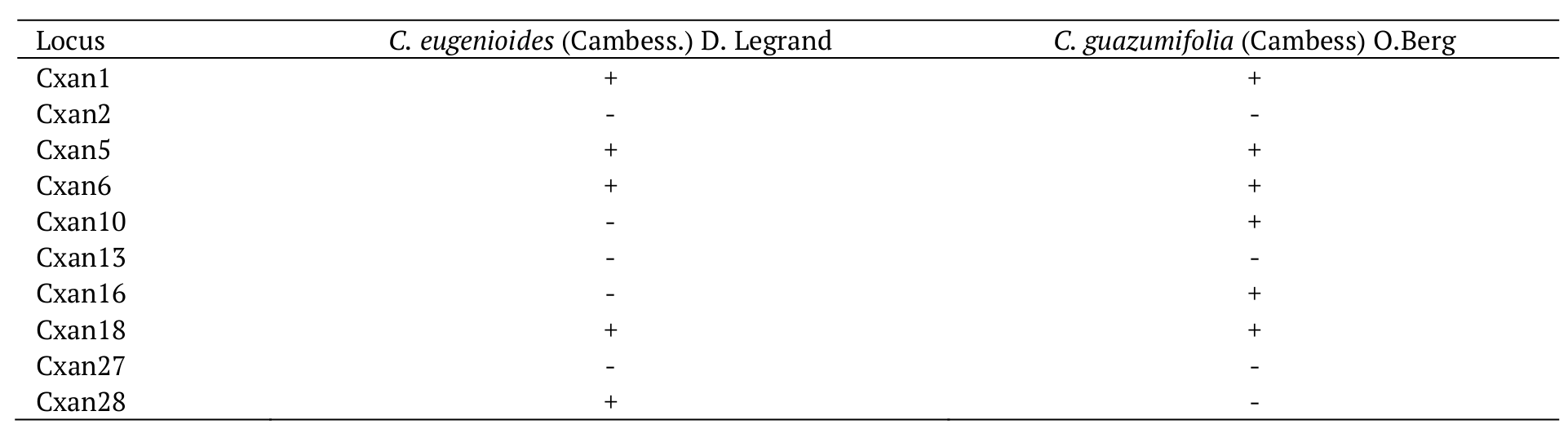We also tested the developed markers for cross-species amplification, with a success in the transferability rate of five and six loci for C. eugenioides and C. guazumifolia, respectively (Table 4).