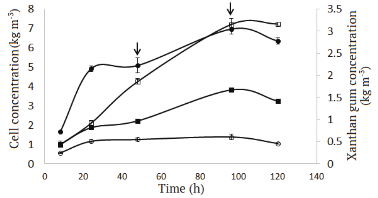 The carbon/nitrogen ratio in addition to having an effect on xanthan gum production also affects bacterial growth (Assis et al., 2014). An excess of carbon and low concentrations of nitrogen are essential for production of xanthan gum (Sutherland, 1983; Lo, Yang, & Min, 1997). The production of gum was two times higher in the simple medium, in which the carbon/nitrogen ratio was high. In this medium, a well-defined stationary phase was observed, and the highest production of gum coincided with this phase. In the complex medium (with peptones and extracts), the cell concentration increased throughout the time, as well as the concentration of xanthan gum, showing that high concentrations of nitrogen in this case were detrimental for gum production but led to a greater cellular growth. Lo et al. (1997) showed that a moderate concentration of nitrogen source at the beginning of the fermentation process combined with a high concentration of carbon source leads to an optimization of xanthan gum production, since it accelerates fermentation and increases production of gum.