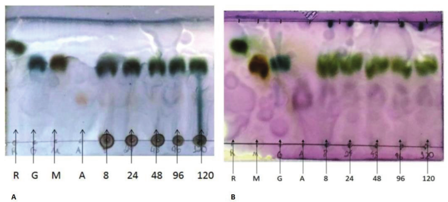 The spots related to glucuronic acid were very tenuous and were not very visible. The literature shows that the percentage of glucuronic acid present in xanthan gum is almost five times lower than the percentage of mannose and glucose (Assis et al., 2014), which explains the observed. Glucose and mannose, despite having bands at the same retention value (Rf), have different colors which allowed their visualization, indicating the presence of both in the gum obtained (Moreira et al., 2001). The addition of glucose did not change the composition of the produced polysaccharide.