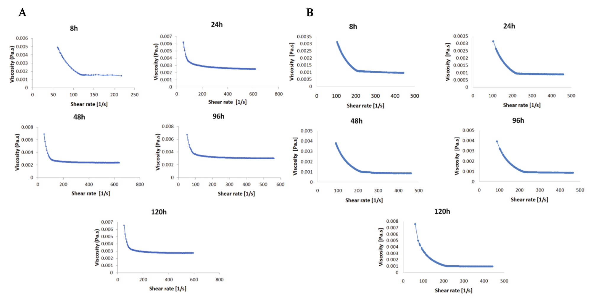 The viscosity of the gum did not vary along the cultivation remaining between 0.001 and 0.004 Pa.s for shear rates higher than 200 s-1. The viscosity showed an increase of 25% after 96 hours in the experiments using complex medium with glucose supplementation, which was not observed in simple medium, it kept the same viscosity (data not shown).