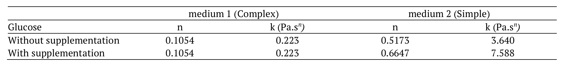 The behavior index (n) also increased in medium 2 (simple), showing a reduction in the pseudoplastic behavior. Glucose supplementation caused no change in the behavior and consistency indices in the complex medium. However, in the simple medium, glucose supplementation increased both indices.