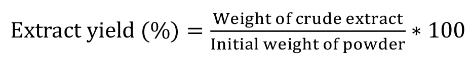 The bioactive ingredients of medicinal plant leaf samples were extracted using maceration method as described in Rai, Pai, Kedilaya, and Hegde (2013). Methanol was used for extraction. The leaf powder of each species and solvent were added into separate conical flasks in the ratio of 1:10 (for every gram of leaf powder, 10 mL of solvent). The flasks were tightly closed and placed on an orbital shaker at a speed of 170 rpm. The content of each flask was shaken for 72 hours under room temperature. The extract of each species was decanted to new flasks in the presence of four layers of cheese cloth and cotton. The residue was squeezed to the flasks and discarded. The crude extract was further passed through Whatman no. 1 filter paper. The solvent was evaporated using rotary evaporator. Dried extracts of each species were stored at 4ºC until used for antibacterial testing. Extract yield (%) was determined gravimetrically using the dry weight of the extract and the initial weight of the leaf powder as follows: