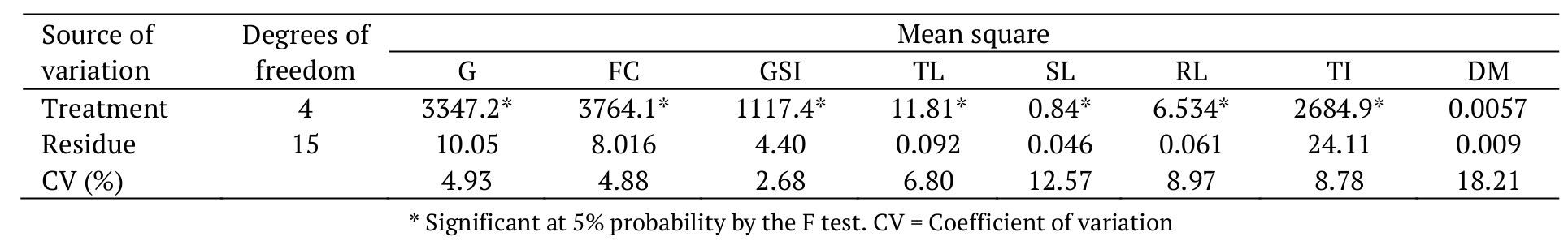 The analysis of variance indicated significant differences (p < 0.05) as a function of the treatments for all the variables, except seedling dry mass (Table 1).