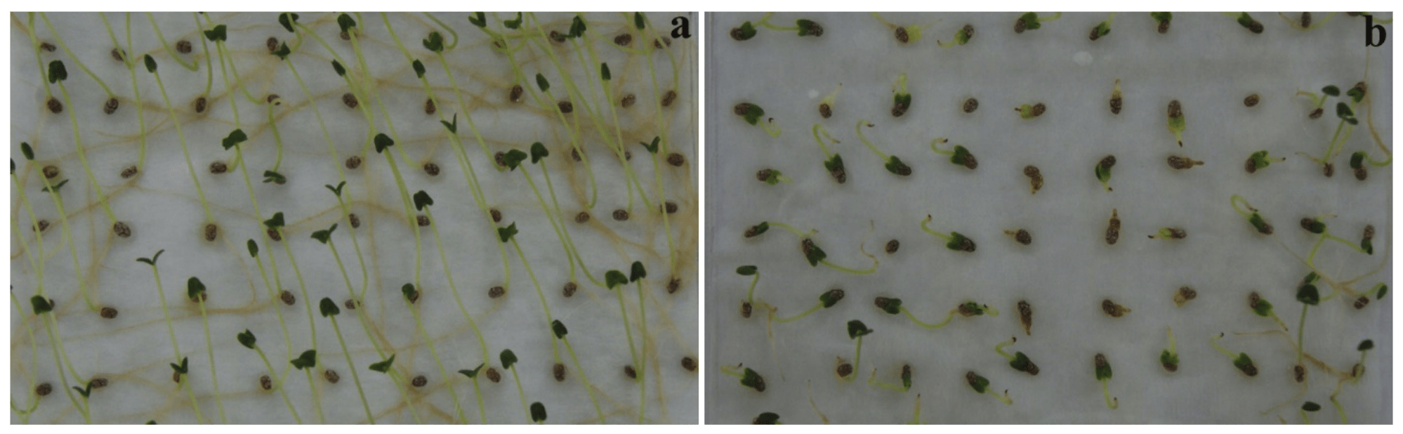 On the other hand, Guilherme et al. (2015) observed that wheat seeds exposed to Cd exhibited a decrease in percentage of normal plants starting at a concentration of 0.03 mM compared to the experimental control. During initial seedling growth, concentrations of 0.06 mM and 0.12 mM inhibited root and stem growth, respectively, which reduced the dry mass of the seedlings. Similarly, Alfiya and Dheera (2015) evaluated the effects of various Cd concentrations (0.5, 1, 1.5 and 2 mM) on Brassica juncea and found that as the metal concentration increased all of the parameters (root and stem length, seedling size, fresh and dry mass, germination percentage and phytotoxicity) decreased. In addition, Ahmad et al. (2016) used 200 uM of Cd and found that the stress from the metal significantly decreased the length of the stem and root of chickpeas, and Hu et al. (2015) observed a 48% reduction in root length, 34% reduction in stem length and 13% reduction in fresh mass of crambe seedlings exposed to 0.1 mM of Cd (11.2 mg L-1).