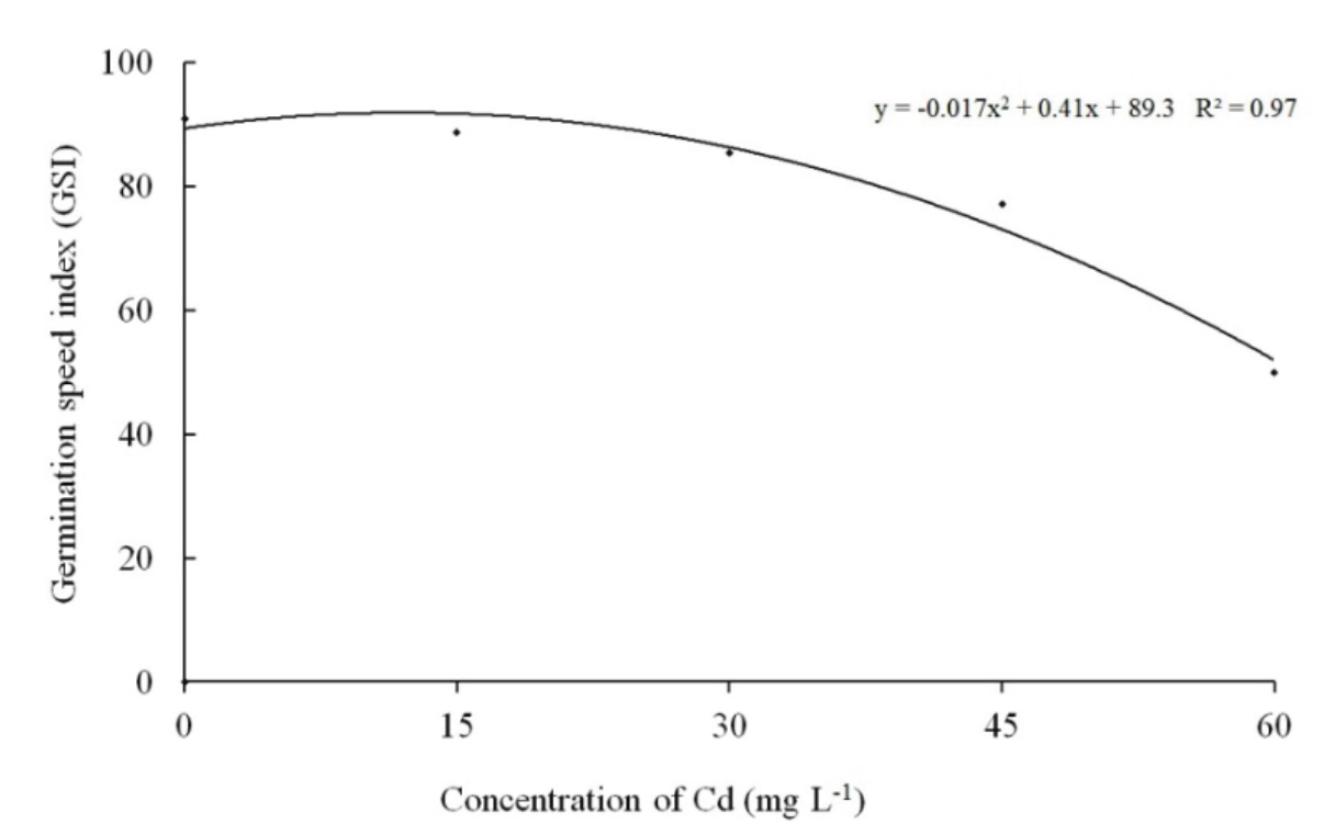 Starting at 30 mg L-1, germination speed was reduced as the Cd concentration in the substrate increased (Figure 3). The reduced speed is probably related to a decrease in enzyme activity linked to embryo growth and the protrusion of the radicle, because Cd disrupts development, cellular differentiation and growth through changes in the activity of the enzyme peroxidase (Santos et al., 2013). A delay in germination can occur due to the protective role of the integument, which can block and retain toxic metals on its surface (Sun & Luo, 2014).