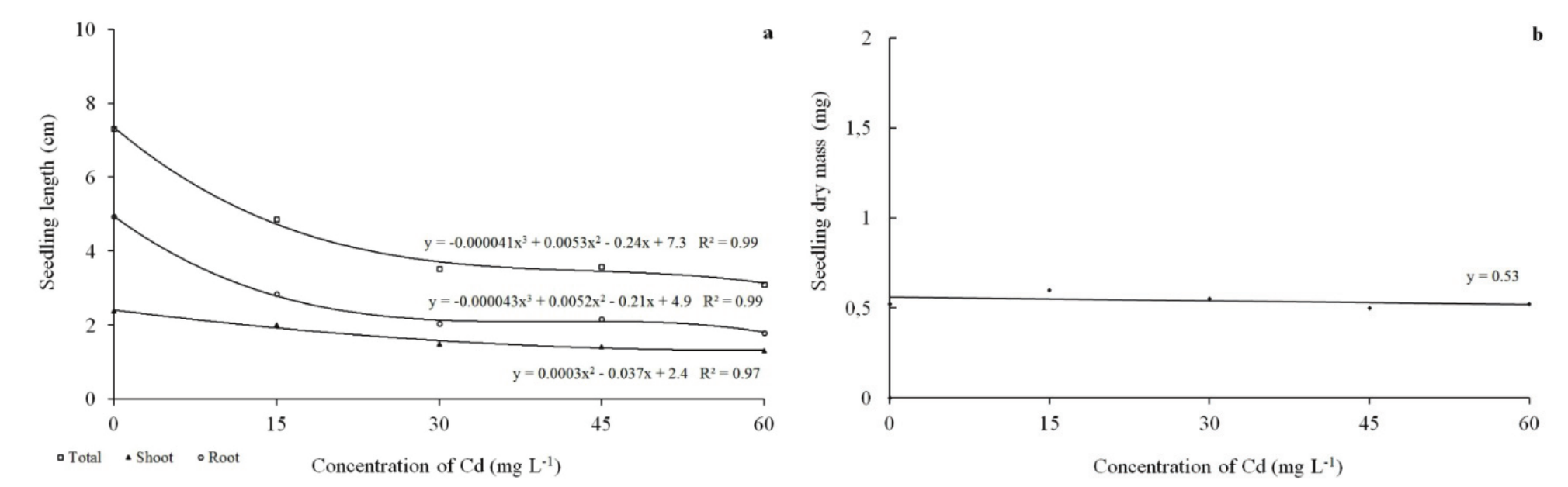 Similar results were obtained by El Rasafi et al. (2016) for bean seeds exposed to 10 to 1000 mg L-1 of Cd. The authors verified that this metal significantly affected seed germination starting at 50 mg L-1. In the same way, Ahmad et al. (2012) studied the tolerance of wheat seeds to Cd (0 to 80 mg L-1) and observed a significant reduction in the percentage of normal seedlings starting at 20 mg L-1. In addition, Gharebaghi et al. (2017) evaluated the response of basil (Ocimum basilicum) to Cd treatments (0 to 20 mg L-1) and verified that germination was inhibited compared to the control. According to El Rasafi et al. (2016), inhibition by toxic metals depends on the concentration used, the metal itself, and the plant species. The effect of toxic metals can also be influenced by the ability of a metal to interact with the tegument and embryo tissues of the seeds of different species and depends the physical-chemical properties of these elements. Different plant species have varying types of seed teguments, structure and anatomy; therefore, among species, the same concentration of an element can have different toxic effects (Ko, Lee, & Kong, 2012).