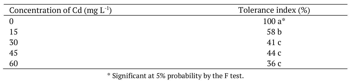 The tolerance index for 15, 30, 45 and 60 mg L-1 was 58, 41, 44 and 36% (Table 2), indicating that the Cd concentration in the substrate caused a decrease in root length. This index reflects the ability of seedlings to grow in environments with high concentrations of a metal and, consequently, indicates that the chia plants should only be recommended for cultivation in areas with low Cd levels.