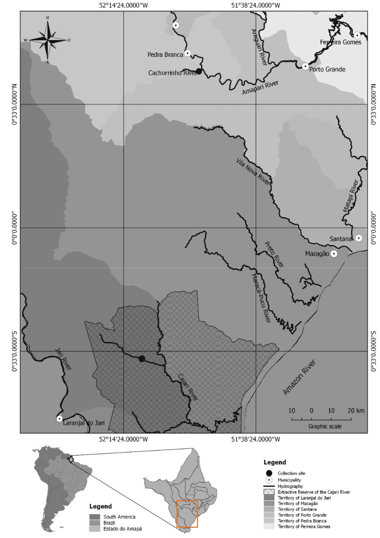 The rivers Cachorrinho and Cajari presents large areas of flood plain, with very peculiar characteristics, since they are strongly influenced by the high rainfall of the Amazon region. These are highly complex river systems and regulation of them is a process that affects the integrity of the river-plain flood system. The vegetation of these hydrographic basins is typical of savannah and forest of dryland (Queiroz, Silva, Reis, Lima, & Lima, 2011), and system of both basins has not signals of anthropic eutrophication. In stream from the Cajari River, the dissolved oxygen (6.6 ± 0.3 mg L-1), temperature (29.3 ± 0.1ºC) and pH (6.4 ± 0.3) were measured using a multiparameter probe (Horiba U52 model, Kyoto, Japan). In stream from the Cachorrinho River the dissolved oxygen (6.3 ± 0.2 mg L-1), temperature (30.1 ± 0.1ºC) and pH (6.2 ± 0.1) were measured.