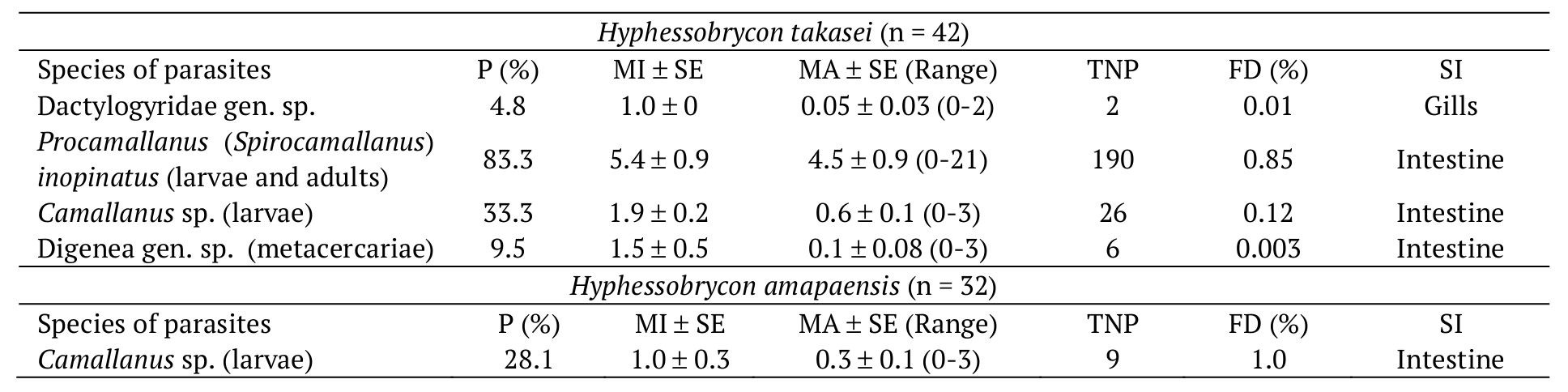 Species of the genus Hyphessobrycon, in general, are omnivorous fish, feeding mainly on insects, algae, detritus, vegetal fragments and microcrustaceans. They are ornamental fish found mainly in environments with aquatic macrophytes (Malabarba, Carvalho-Neto, Bertaco, Carvalho, Santos, & Artioli, 2013; Vieira et al., 2016). Hyphessobrycon takasei Géry, 1964 is a benthopelagic fish with distribution in the basins of the rivers Araguari and Oiapoque (State of Amapá, Brazil) and French Guiana (Lima et al., 2003; Froese & Pauly, 2019). Hyphessobrycon amapaensis Zarske & Géry, 1998 is also benthopelagic and endemic from the state of Amapá, northern Brazil (Froese & Pauly, 2019). Both species of ornamental fish, H. takasei and H. amapaensis, have great potential of use in aquaculture. Thus, the aim of this study was to compare the parasitic fauna of two congeneric species H. takasei and H. amapaensis both native of two basins from the Amapá state, Brazil.