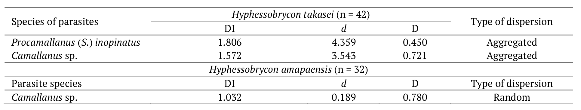 For Hyphessobrycon spp. species of Protozoa, Myxozoa, Monogenea, Digenea Nematoda, Acanthocephala and Crustacea are known (Table 4). However, none of these species were found in H. takasei, which was parasitized by one species of Monogenea, one Digenea and two Nematoda, or in H. amapaensis that was parasitized only by one species of Nematoda. Therefore, there was a dominance of nematodes in H. takasei. For H. takasei, there was an aggregated dispersion of parasites, a common pattern in wild fish populations (Tavares-Dias, Oliveira, Gonçalves, & Silva, 2014; Tavares-Dias, Oliveira, Gonçalves, Neves, 2017; Oliveira, Gonçalves, Neves, Ferreira, & Tavares-Dias, 2017; Ferreira et al., 2019). In contrast, for H. amapaensis the parasite dispersion was random, a typical pattern of parasites with moderate or high pathogenicity, because these regulate the density of the host population (Moller 2006). Furthermore, low Brillouin diversity and low species richness of parasites was observed in H. amapaensis when compared to H. takasei, probably due to differences among the congeneric species.