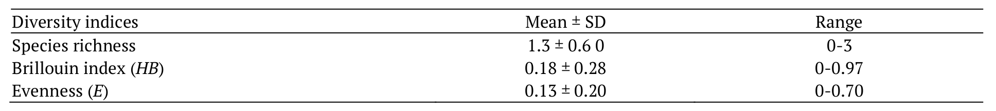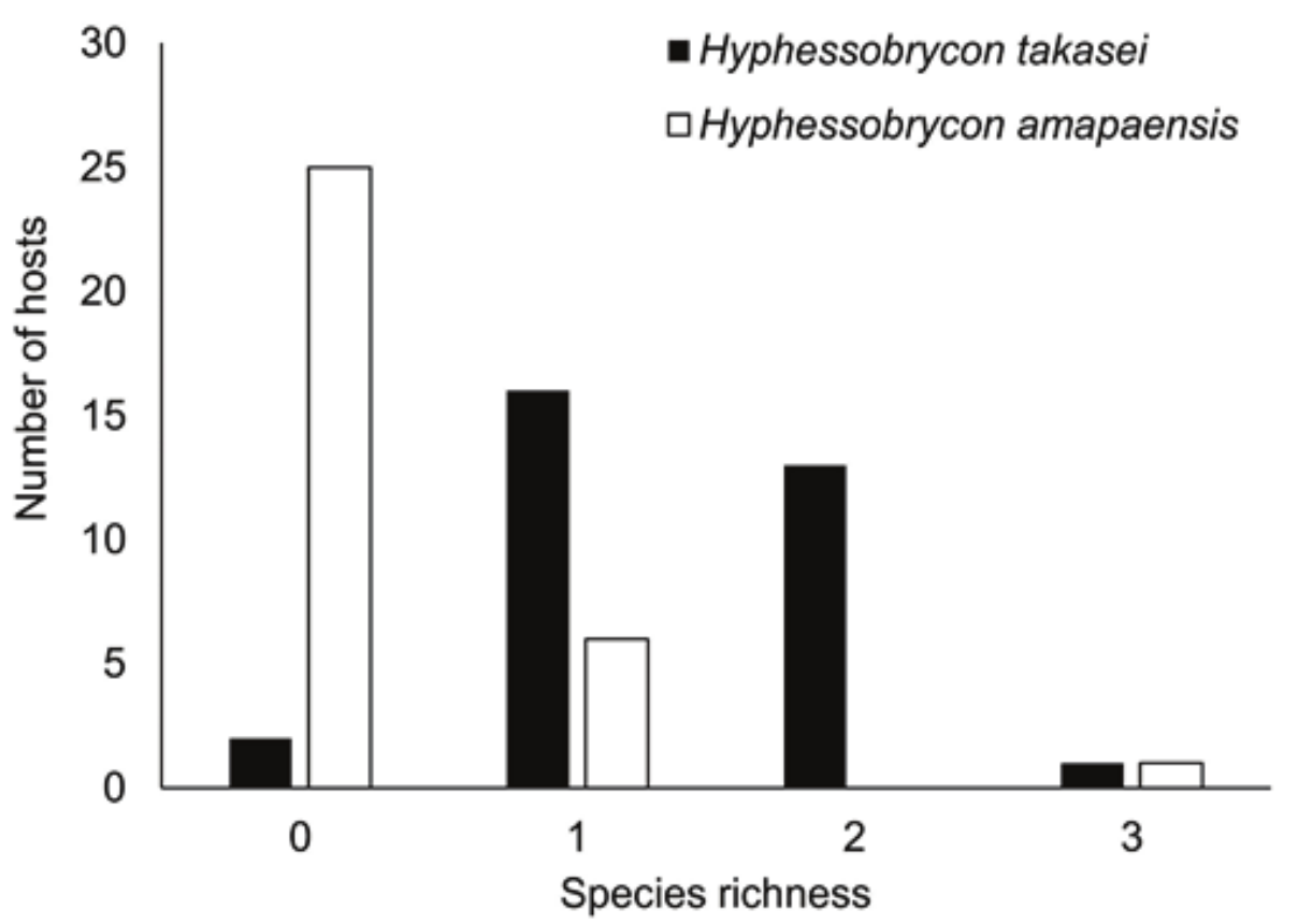 In H. takasei, there was a predominance of hosts parasitized by 1 and 2 species and in H. amapaensis the predominance was of non-parasitized hosts (Figure 2).