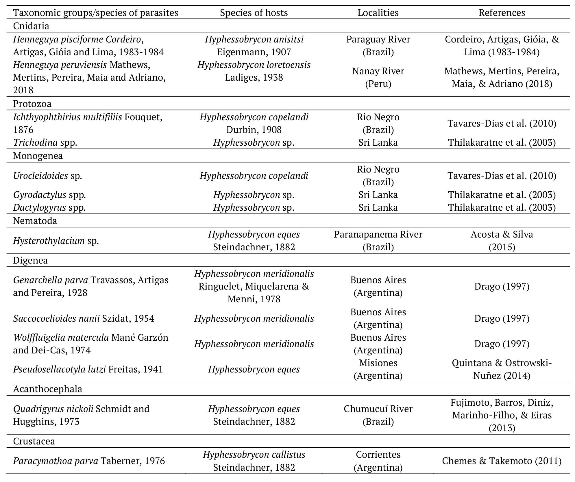 Species of digeneans require intermediate hosts in its complex life cycle (Quintana & Ostrowski-Núñez, 2014; Oliveira et al., 2017; Hoshino, et al., 2018) and are endoparasites that has been reported in low to moderate infection levels in ornamental fish species (Wanlop, Wongsawad, Prattapong, Wongsawad, Chontananarth, & Chai, 2017; Hoshino et al., 2018). However, there were few studies on metacercarial infection of digeneans in species of ornamental fish (Wanlop et al., 2017; Cardoso, Costa, & Balian, 2018), mainly on species of Hyphessobrycon (Table 4). Undetermined metacercariae of digeneans were recovered of intestine of H. takasei and in low infection levels (prevalence of 9.5%, mean intensity 1.5 and mean abundance 0.1) when compared to infection of Pseudosellacotyla lutzi, Genarchella parva and Saccocoelioidesnanii (prevalence of 48.2% and mean intensity 3.5) in Hyphessobrycon meridionalis from lagoon in Argentina (Drago, 1997). Similarly, low infection levels by Centrocestus formosanus metacercariae were reported for Poecilia latipinna (prevalence of 16.7% and mean intensity 1.4) and Puntigrus tetrazona (prevalence of 10% and mean intensity 2.0), in contrast the reported for koi Cyprinus carpio (prevalence of 36.7% and mean intensity 70.8) (Wanlop et al., 2017). Digenean metacercariae recovered of H. takasei was not identify; however, P. lutzi, G. parva and S. nanii are only the species of digeneans known by infect Hyphessobrycon spp. (Table 4).