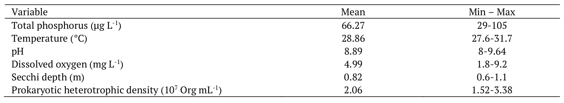 Armando Ribeiro Gonçalves Dam is a eutrophic reservoir of multiple uses in a Brazilian semi-arid region (05°67’ S; 36°88’ W) with great water storage capacity (2.4 billion m3), and it is responsible for the water supply of 500 thousand people approximately. Measurable abiotic variables and quantification of prokaryotic organisms in the sampling site were estimated and analyzed between March 2010 and March 2012. Minimum, maximum and mean values are shown in Table 1.