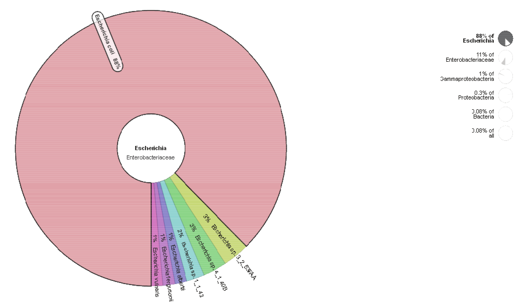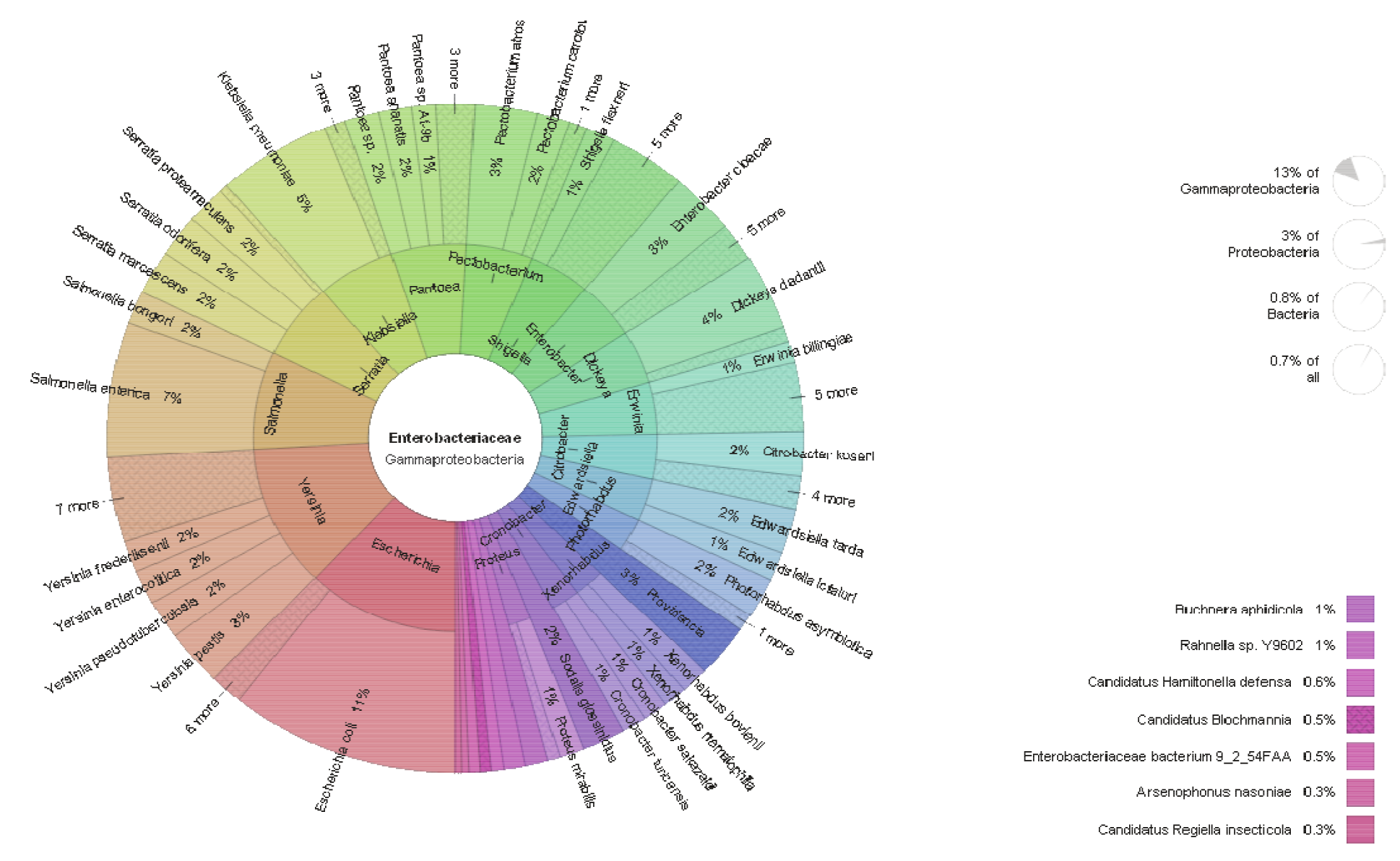 A total of 23 genus and three candidates to genus of Enterobacteriaceae family were revealed in this study. This family represented 13% of Gammaproteobacteria class, 3% of Proteobacteria phylum, and 0.8% of all detected Bacteria (Figure 1).