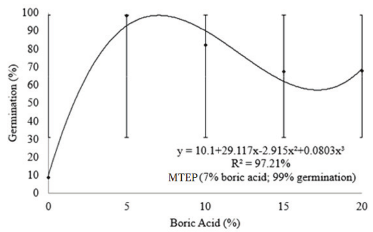 In this way, as the germinative percentage obtained was show below value considered satisfactory (80%), the effect of adding boric acid to the culture medium was evaluated, considering the best results obtained previously.