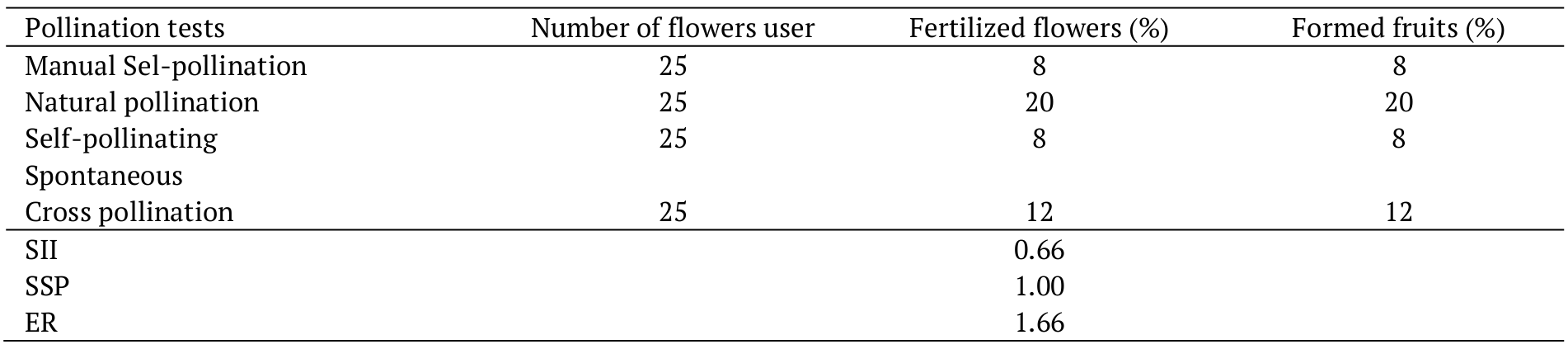As for ER, it was high (1.66) (Table 2), due to the high percentage of fruiting, and the absence of abortions in flowers submitted to cross-pollination and in natural conditions, indicating good efficiency in the transfer of viable pollen to the stigma of the flower, either through pollinators or also by the wind.