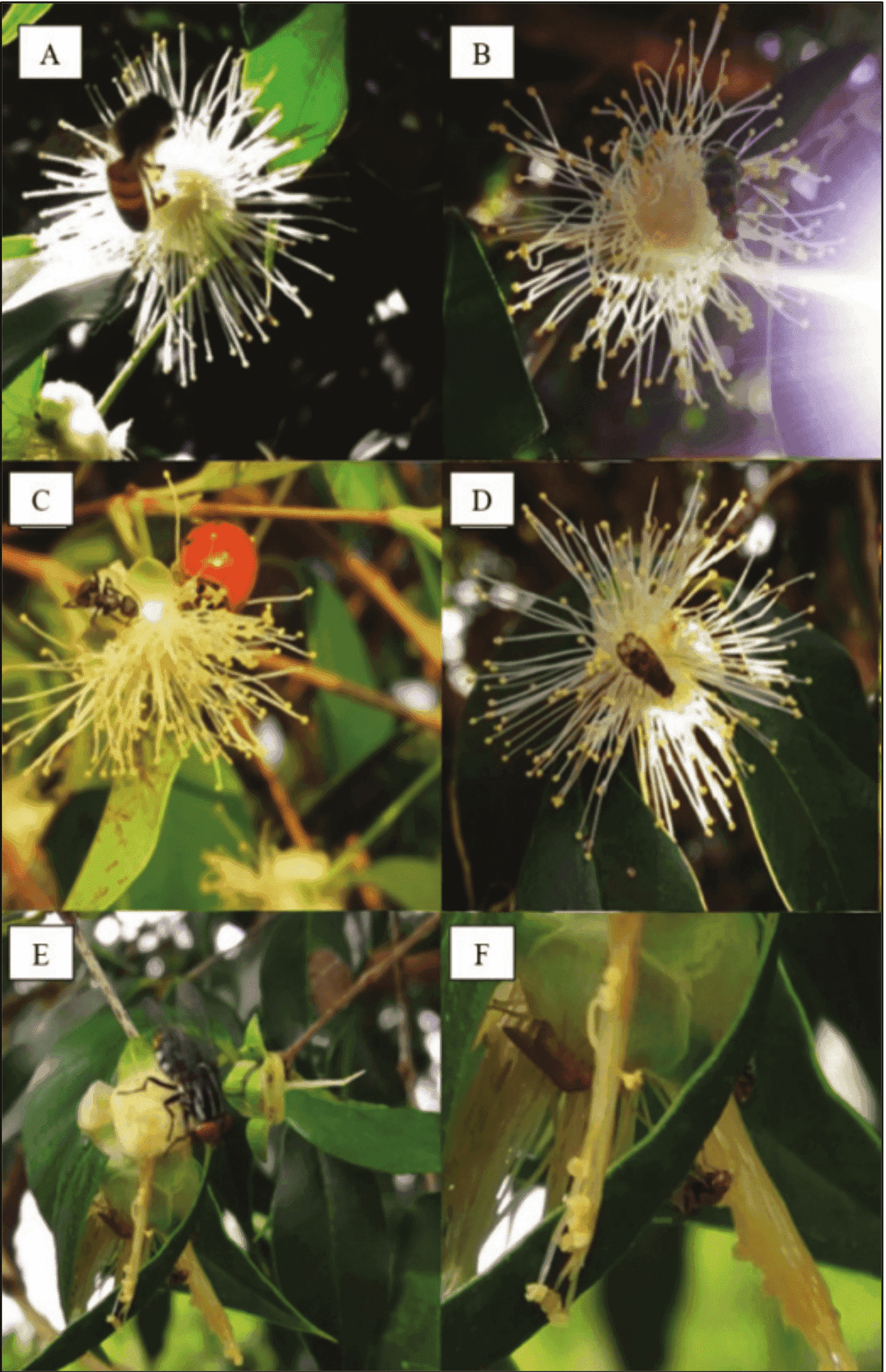 The identified flies and wasps were observed moving between the flowers of the same plant, sometimes touching both reproductive structures, thus being able to be characterized as occasional guabiju pollinators (Matias & Consolaro, 2014). According to Faegri and Van der Pijl (1979) flies are not stimulated to visit special parts of the flowers such as anthers or stigma but rather due to the foul odor that becomes attractive for oviposition, ensuring food for the larvae.