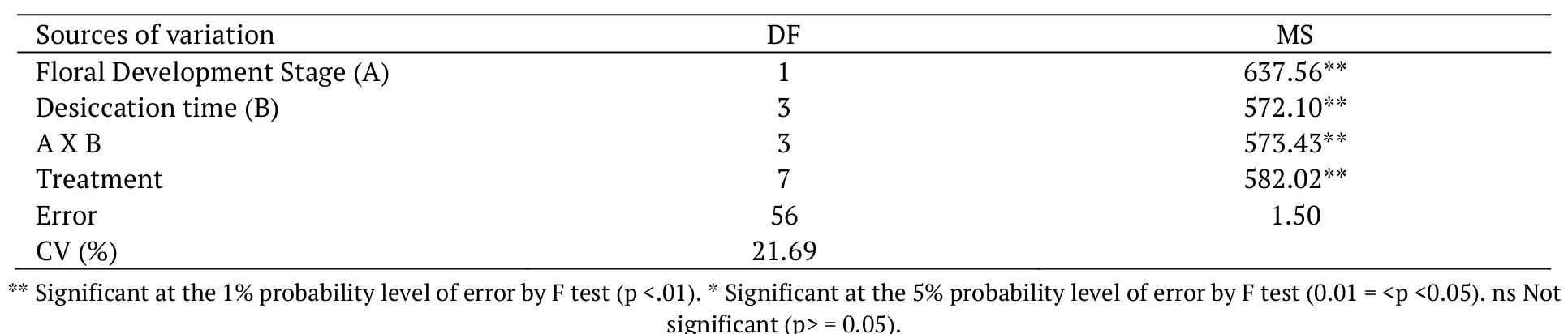 There was a significant interaction at 1% probability level of the error between floral development stage and desiccation time, rejecting the hypothesis of nullity H0 (Table 1).